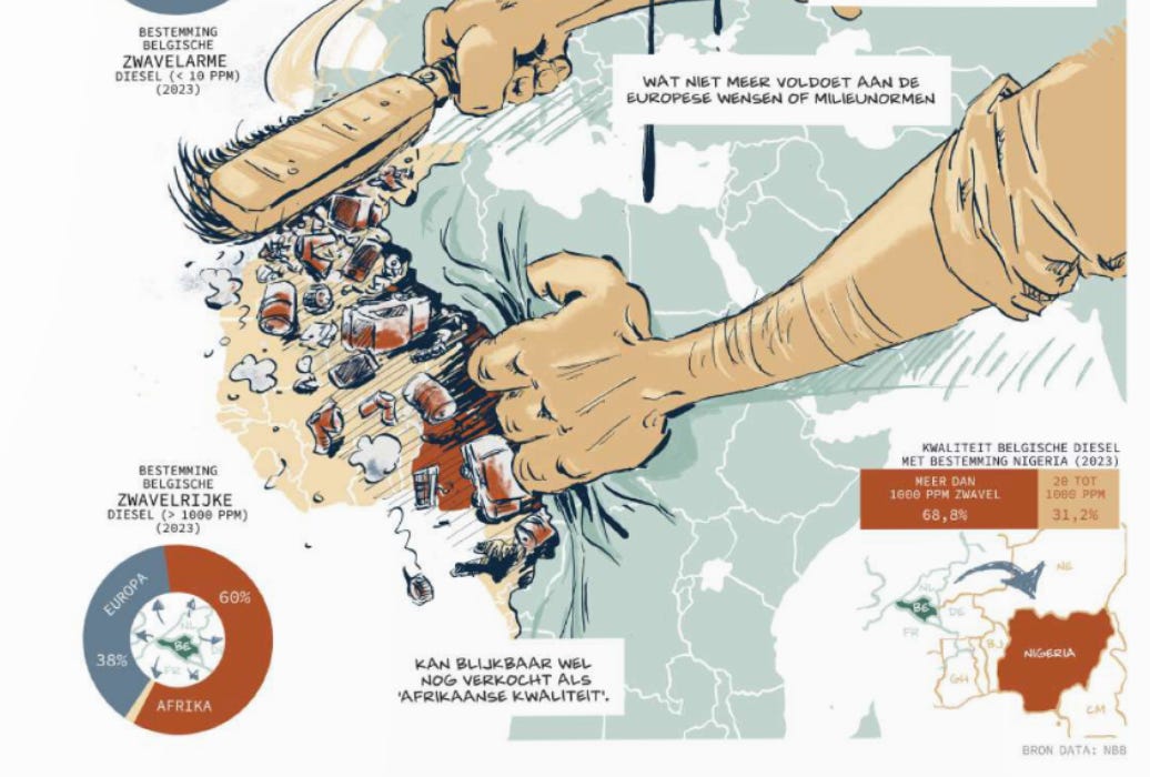 Lees hier ons onderzoek: Waarom Afrika het afvoerputje van de benzinehandel blijft. Een tekenaar maakte er ook deze toffe stripversie van.