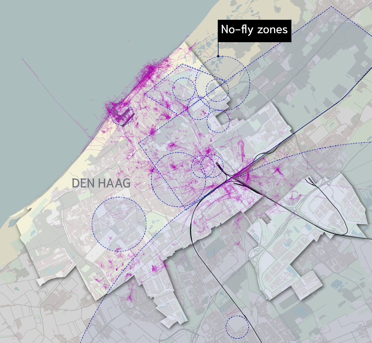 Wat direct opvalt, is dat een groot deel van Den Haag in principe verboden gebied is voor drones. Er gelden no-flyzones vanwege alle paleizen, ministeries, internationale organisaties en andere gevoelige locaties in de stad. Maar daar lijken dronebestuurders zich niet aan te houden. Veel vluchten vinden juist plaats in no-flyzones, zoals bijvoorbeeld boven de haven van Scheveningen.